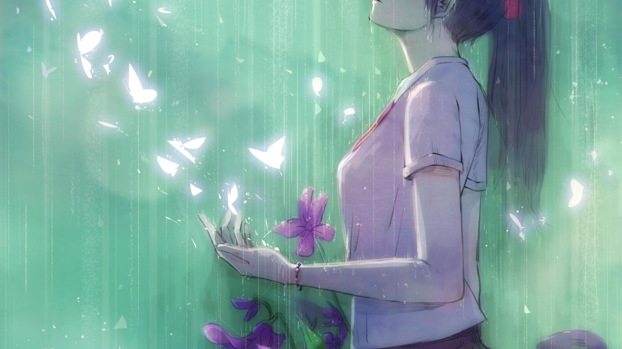 Girl Butterflies Rain Anime Art